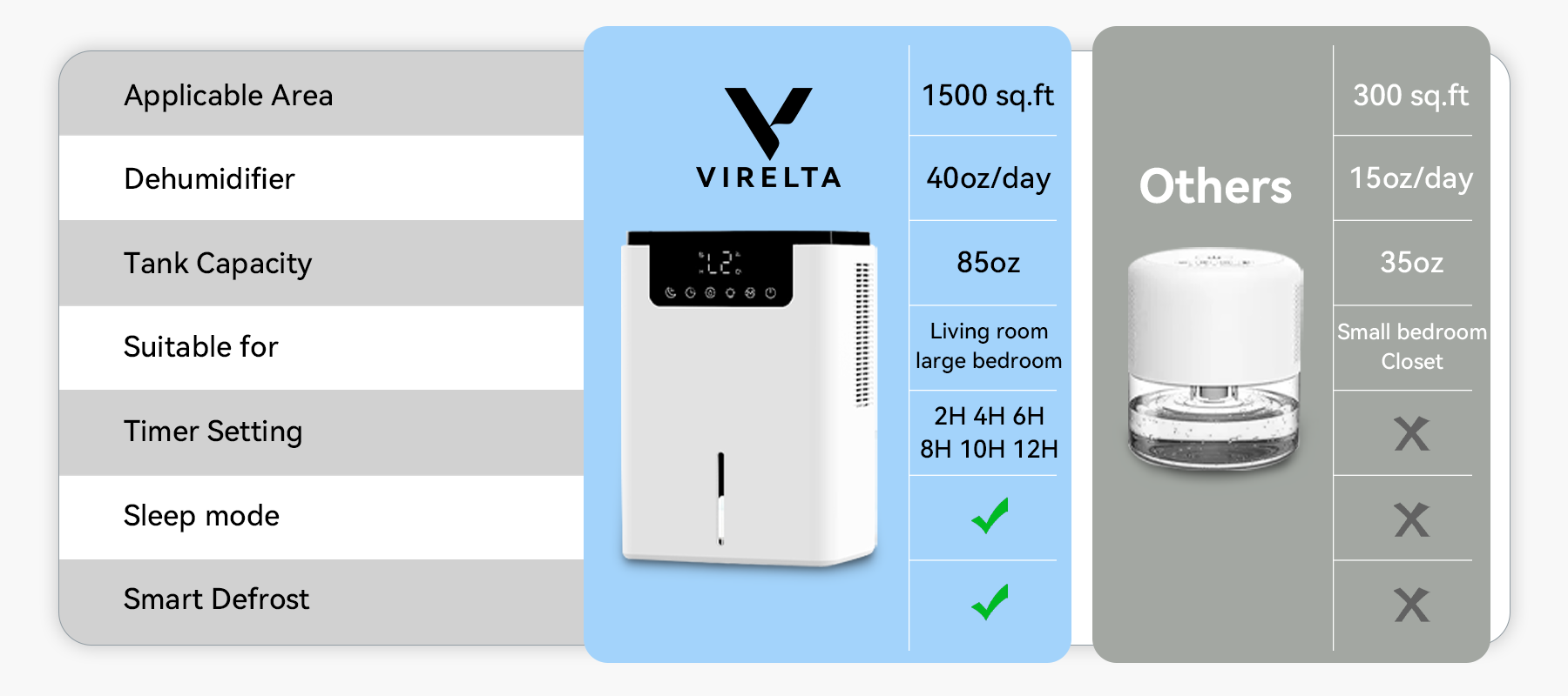 Virelta' dual-core powerful dehumidification technology uses two independent dehumidification systems for double the efficiency. This means whether it's the rainy season or stubborn dampness, it quickly removes moisture from the air, banishing stickiness and musty odors for a home that's instantly fresh and dry.