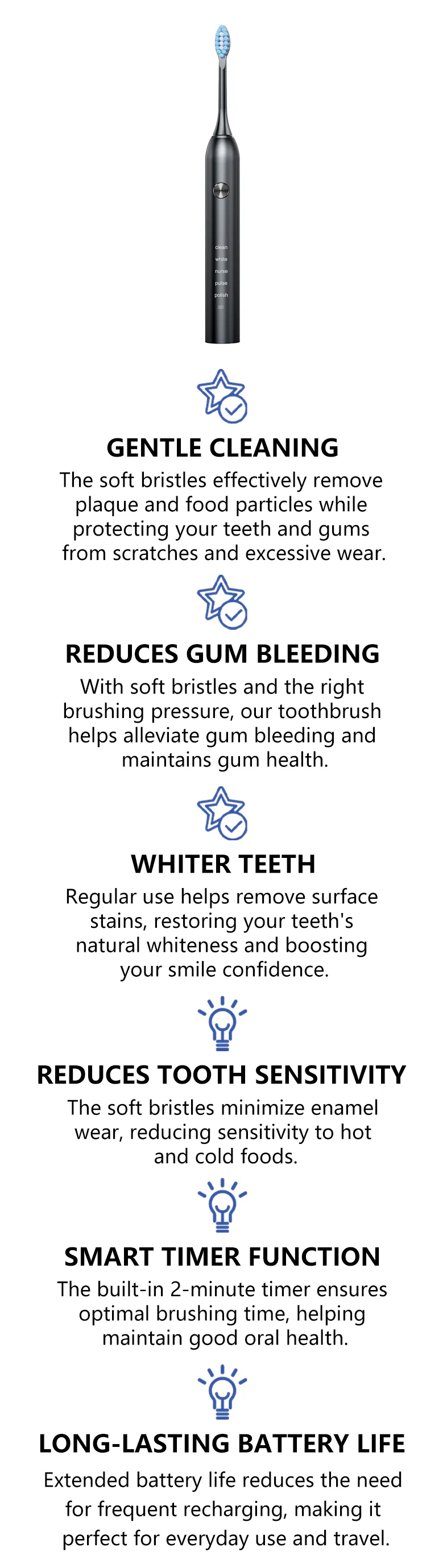 - Smart Timer Function - 30-second zone change reminder and 2-minute auto stop for optimized brushing.