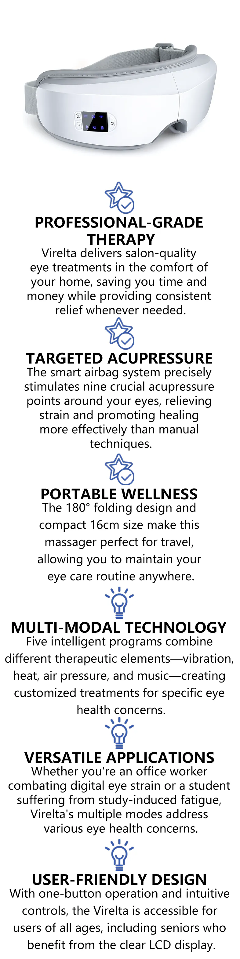 Virelta features the leading Dual Airbag 4D Stereo Massage technology, precisely simulating a professional masseur's pushing, pressing, rubbing, and kneading techniques. It provides a full-wrap sensation targeting 9 major acupoint clusters with deep compression, especially focusing on independently soothing the often-tight temples. Immerse yourself in the unprecedented ultimate relaxation brought to you by Virelta with every use.